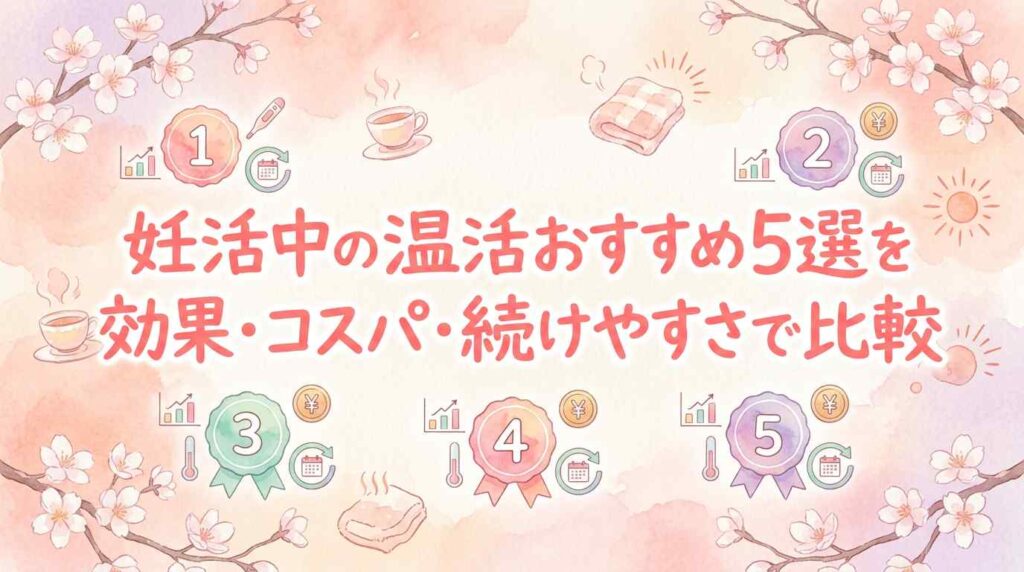 妊活中にできる温活方法を5つピックアップし、効果・コスパ・続けやすさの3軸で比較しました。