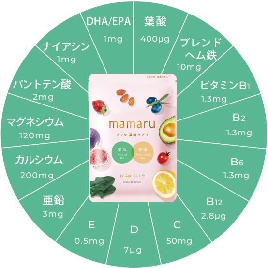mamaru![]() >>公式サイト | 定期便初回:4,298円 | 無料 | 400µg | 妊娠中期 〜 妊娠後期 | 葉酸に加えて乳酸菌で菌活も可能 腸活 × 鉄分 産婦人科医監修 |