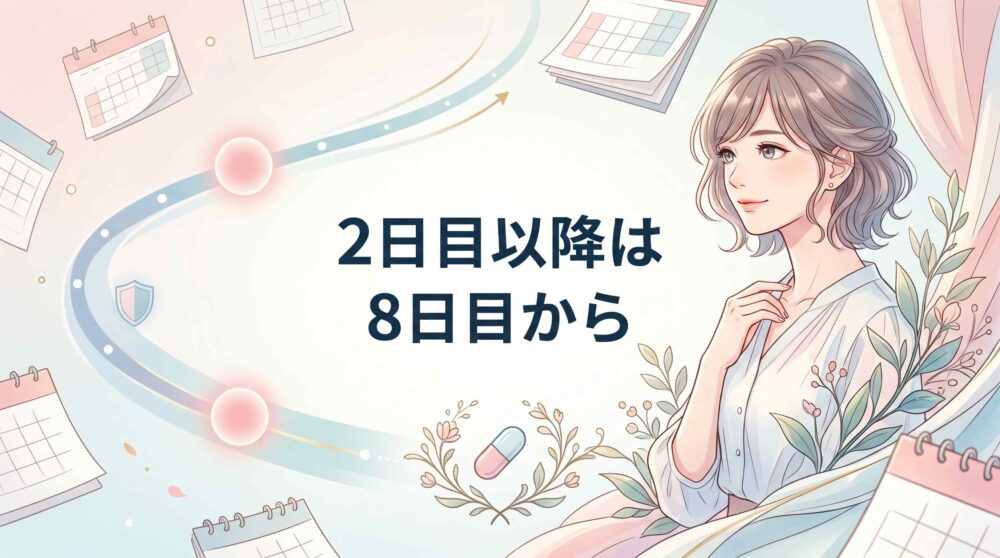 生理2日目以降に服用を開始した場合は、飲み始めた日から数えて8日目以降に避妊効果が期待できると整理されています。最初の7日間はコンドーム等の他の避妊法を併用するのが基本ルールです。詳しい判断基準は2日目以降スタートの避妊効果セクションをご確認ください。