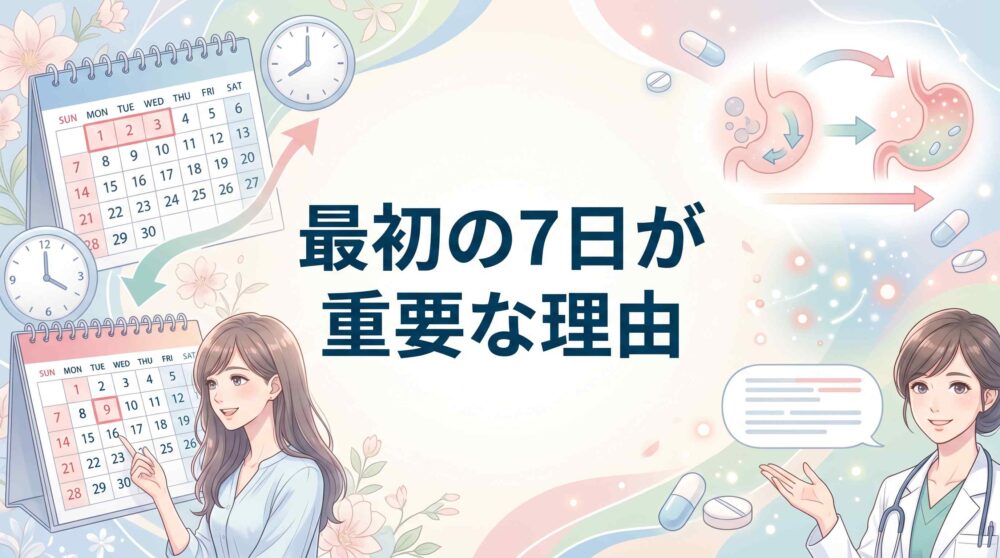 最初の7日間はホルモン濃度を安定させる調整期間で、この期間はコンドーム併用が必須と理解しておきましょう。