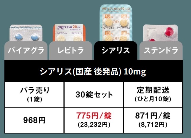 なお、シアリスの特許期間は満了しており、現在は国内の複数の製薬会社からジェネリック医薬品(タダラフィル錠)が販売されています。