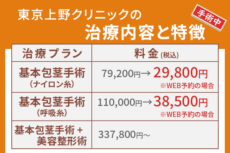 東京上野クリニックでは、通常価格79,200円(税込)の基本包茎手術がWEB予約限定で65%OFFの29,800円(税込)から受けられるキャンペーンを実施しています。